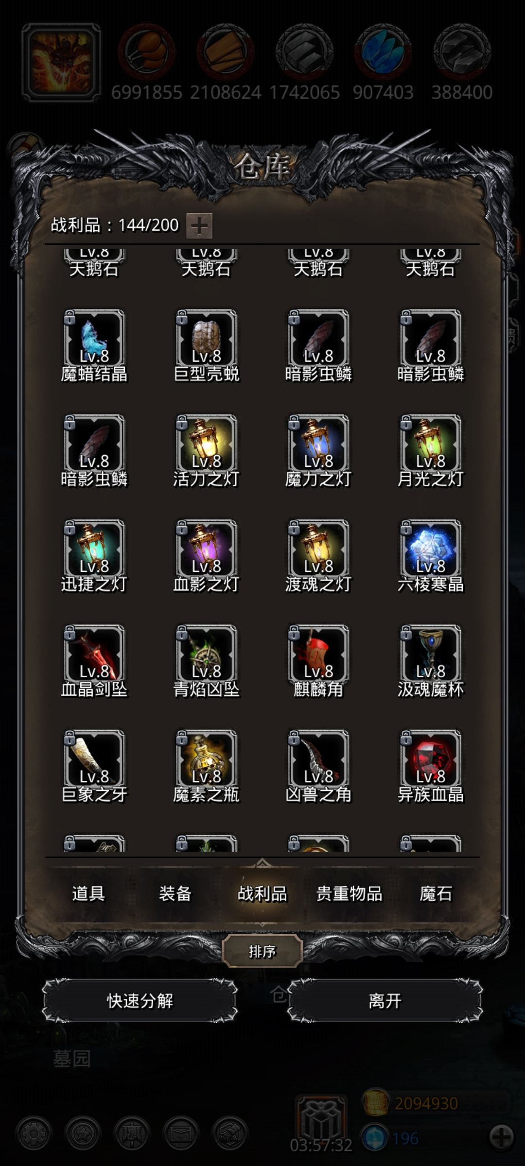 战利品方面,其实小氪的话,礼包战利品就够用了,本人来讲,很少刷战利品。不氪礼包,开局八个紫水晶,图七刷单吸,力量战利品