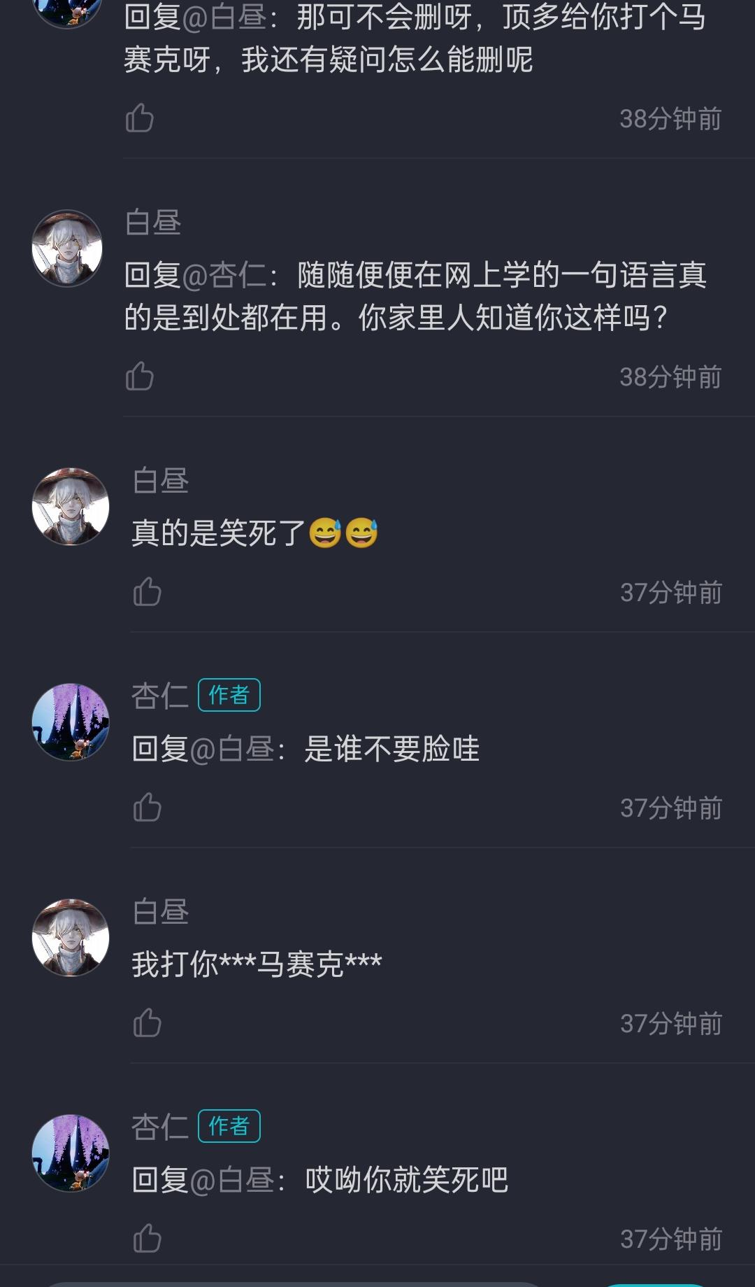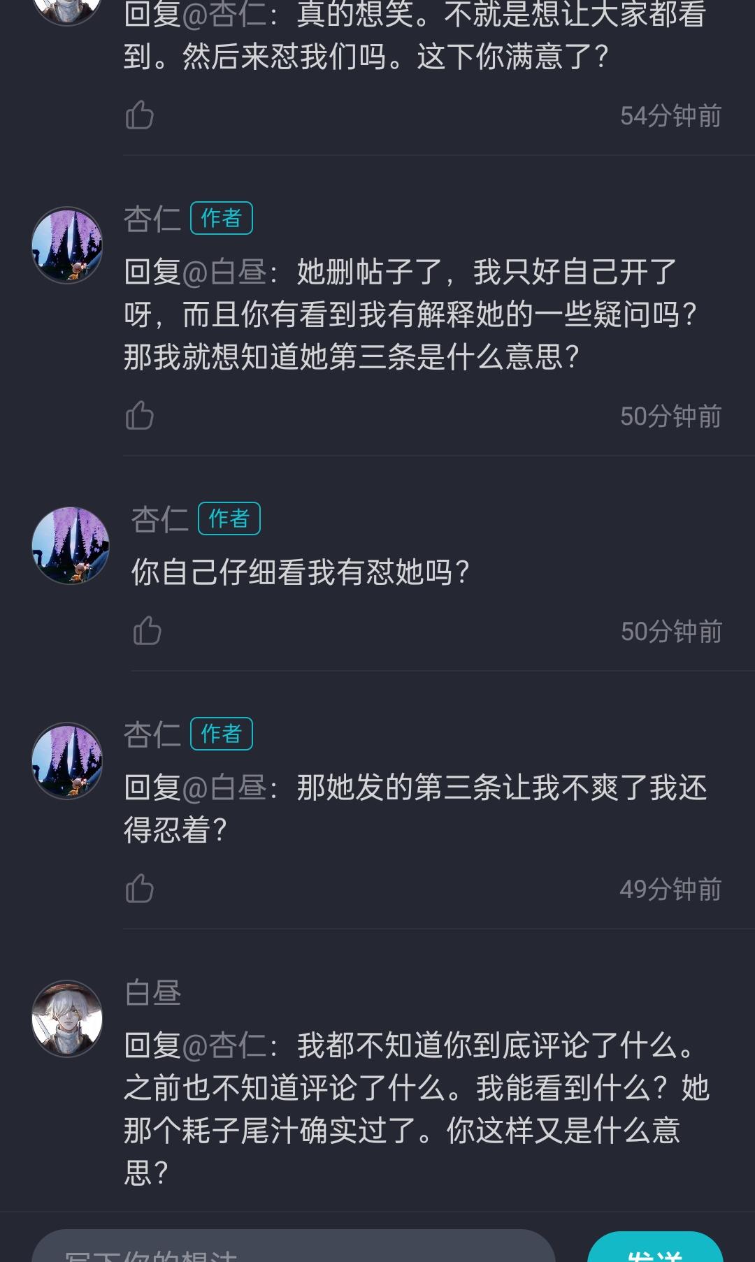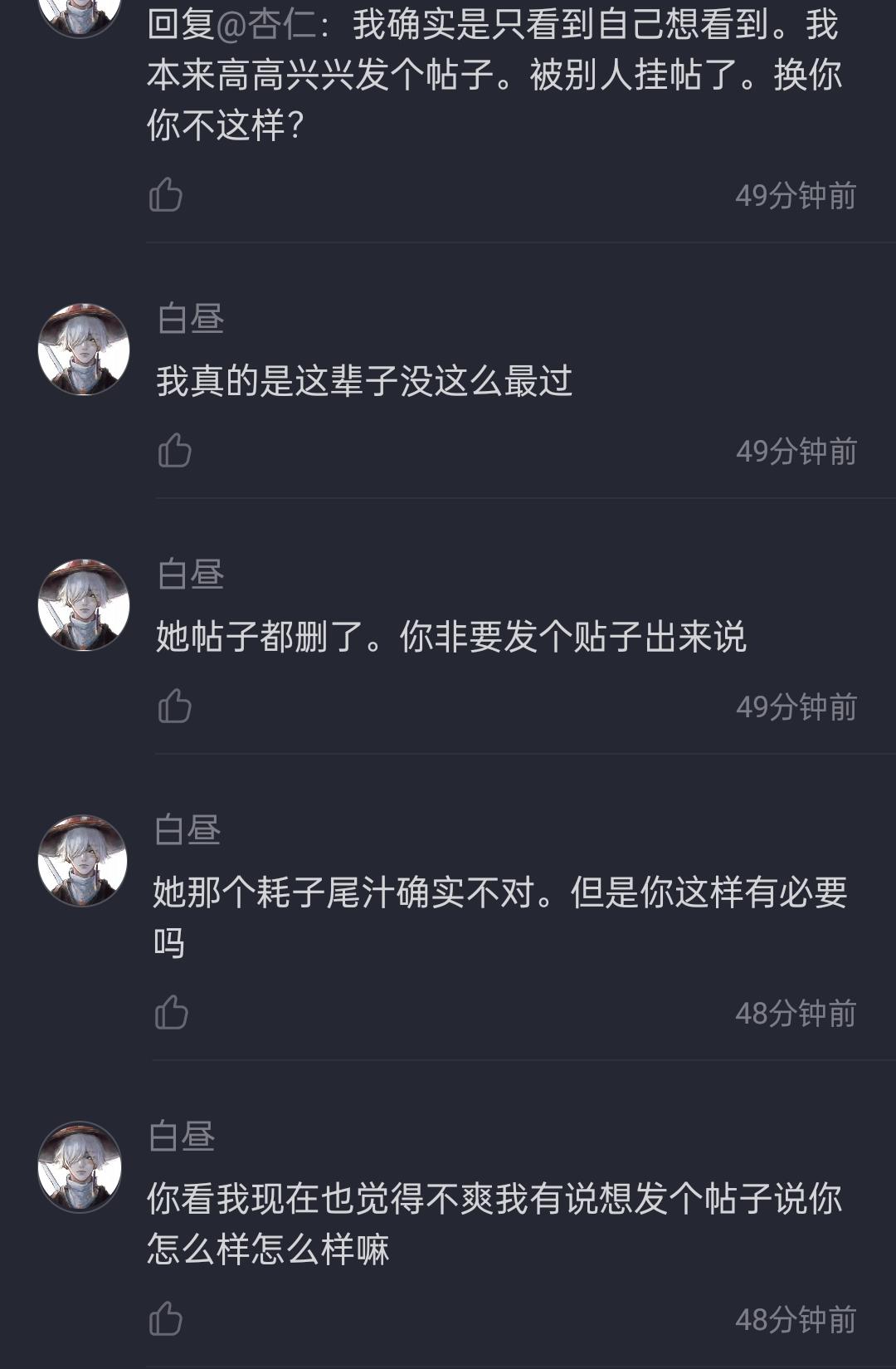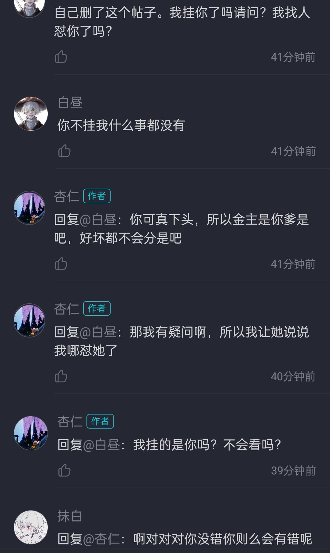 然后第二位主人公登场了,发了一大段话说我看清楚她的要求了吗?balabala说了一大堆,那我是看清楚了呀也有回复啊,我一没冲她,二没怼她,那我不爽了还不能发是吧,我是有好好说这件事是怎么回事,她只会帮她的金主所以好坏都不会分了是吧,哦哦后面她还承认那位发耗子尾汁是有错,说我挂她了,那我挂到她了是我错了,但我原贴的意思是想让原主说我哪怼她了,后面就开始骂起来了不要脸了是吧,但她一开始发的也不是我挂到她的事啊,不就是帮金主不是吗?金主就是你爹呀当然得帮,找什么理由啊