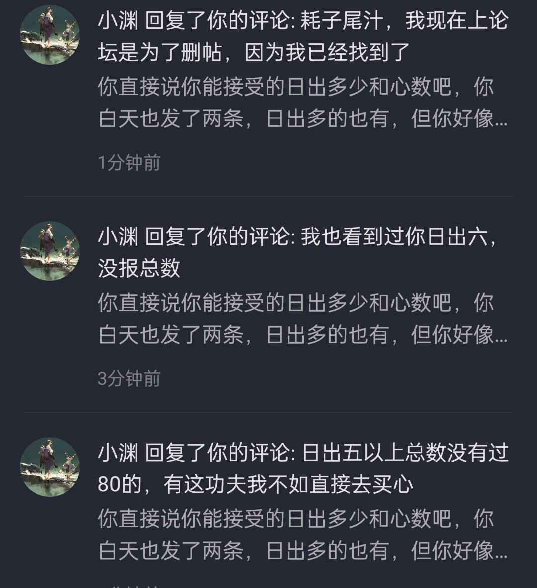 晚上我进来刷帖子,看到她还在d,那我就有些好奇她想要的范围,原话是:你直接说你能接受的心和日出数吧,我看的你白天发了两条,我看到日出多的也有,可你好像都不太能接受,爽快点说你自己能接受的范围吧 。