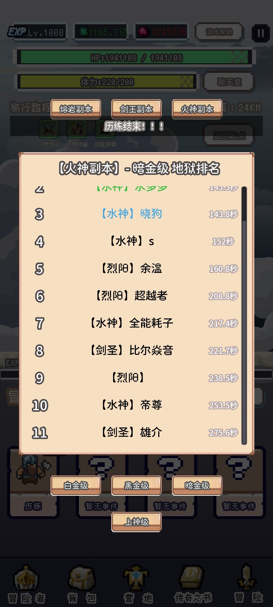 勇者无敌今天连续过了上神和暗金火神(可能图片有点模糊)书是一百七十六级,宝石是11个七级增上还有一个八级,套装是四法皇,2火冠,领域是火神领域,暗金火神是258秒过的,上升火神是二百二十多秒过的,勇者真的崛起了现在已经有两个剑圣在排行榜上了,第二个是我后面打的运气比较差,所以打了275秒