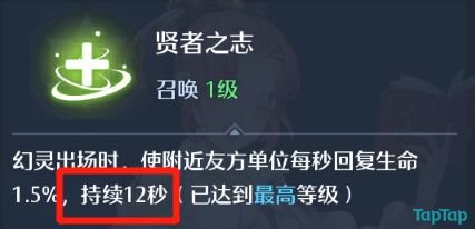 贤者之志:幻灵出场时,使附近友方单位每秒回复生命1.5%,持续12秒。
