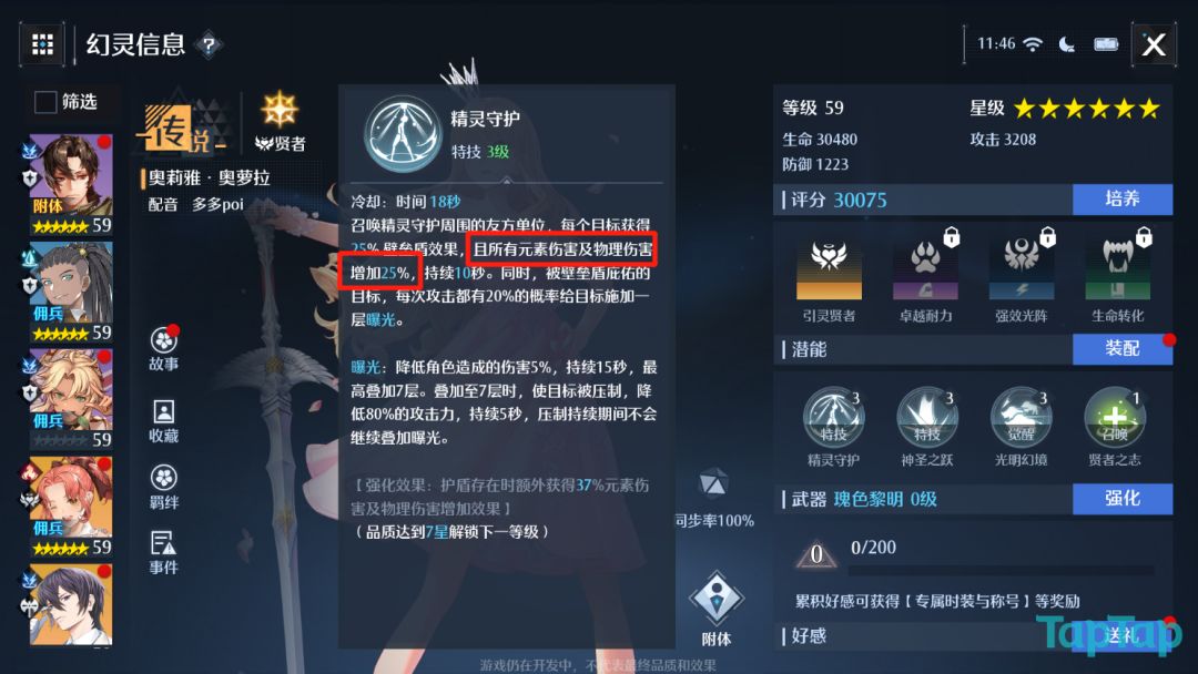 泽达是史诗级幻灵中一个对于伤害增益效果非常强力的贤者,他本身的技能不附带治疗效果,但却能够极大强化队友的输出。在武器强化后释放大招,主角附近会额外产生一个满层的【狂欢之酿】,而主角及附近的队友都会立刻获得增益。所谓满层【狂欢之酿】附带三种效果,第一个是伤害按百分比增加,持续5秒;第二个是获得一个每秒回复一定怒气值的buff;第三个效果属于防御类的,所以咱们可以先不看,但是光有前面两个效果,就足以全场强化整个队伍的输出。