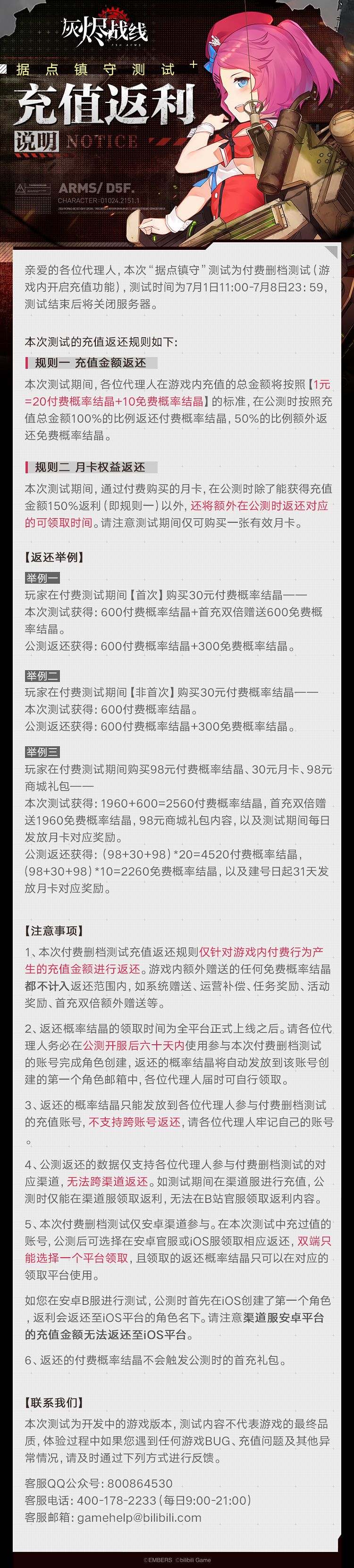 测试期间充值金额将按照以下《据点镇守测试充值返利公告》在公测时返还,请各位代理人阁下知晓,并牢记测试期间登录账号~