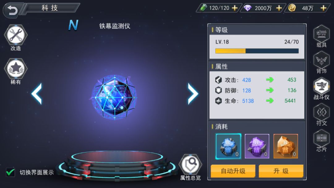 战斗仪和其他的科技也类似,也拥有改造的性能,性能的改造可以让战斗仪的属性得到更好的提升,也能增加人物拥有的属性,让我们在刷本或者打BOSS时候能够更具杀伤力。