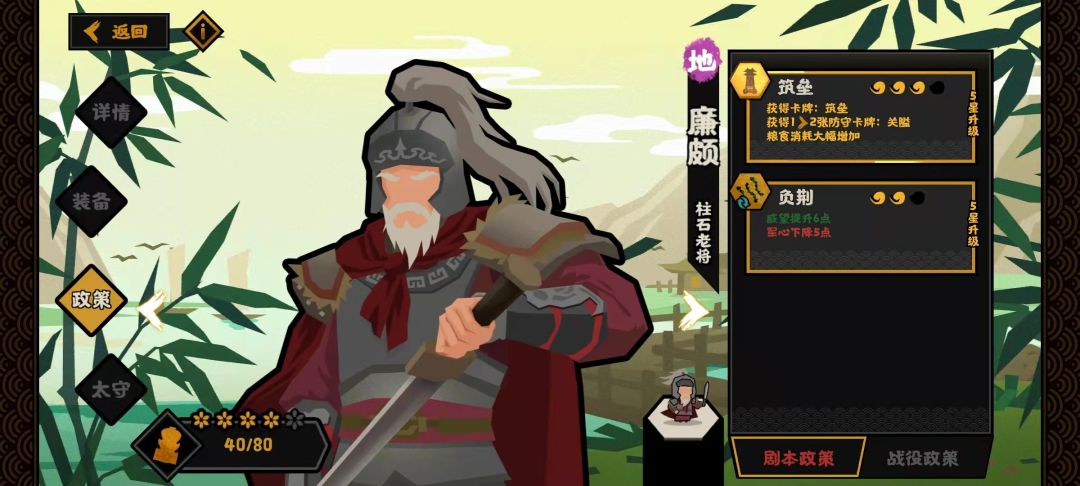 军事两位自然就是赵国双璧,李牧和廉颇。前者纯防守,提供一张伏兵和buff卡。后者多一张关隘进攻卡和两张关隘防守卡总计三张。这两位选谁都行防守战强度都不低的,廉颇也能客串一下低军心或者高威望流。总的来说光是技能就可以值100战力起步。如果星级高了还能带兵防守。汉朝的弓箭速射虽然拉跨,但关隘还是井栏还是连弩都能吃到速射的buff,奠定了防守反击流的防守必胜的基础。
