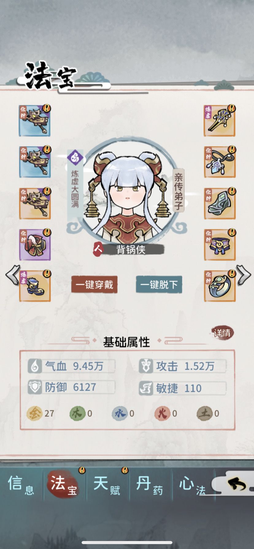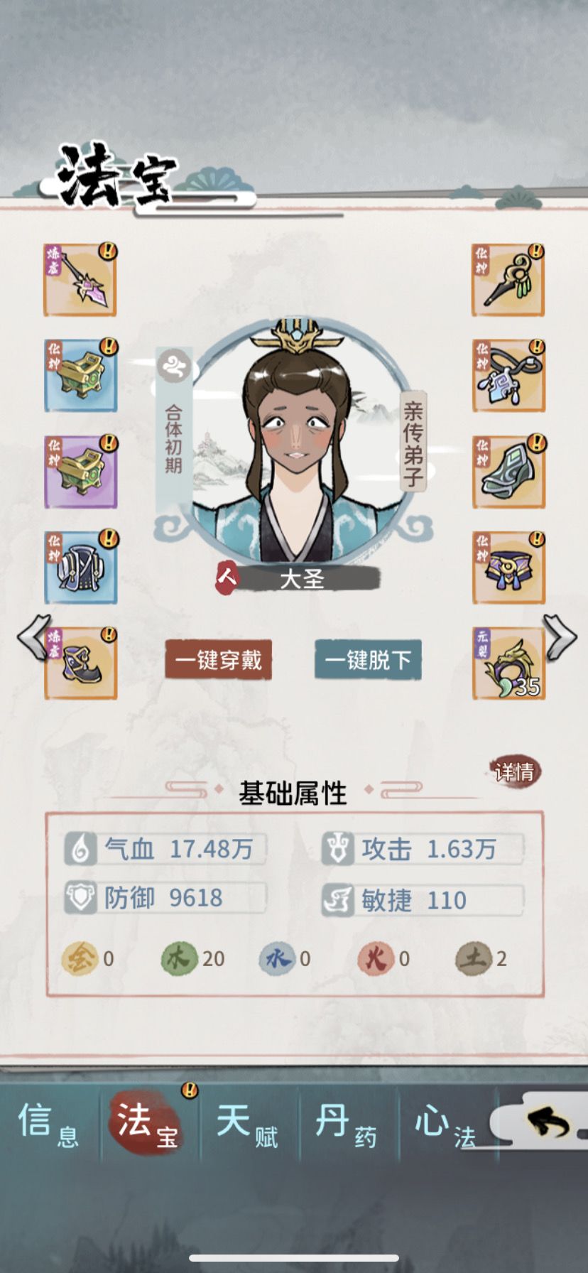 然后主c先去把炼虚饰品双攻的打出来 优先打基础属性攻击的再开始更换心法 橙色最好 蓝色也将就 然后参悟刷脸 出秘笈御宝无论啥颜色 看自己情况给人物换上 然后再考虑神通 神通一定要根据自己法宝来选