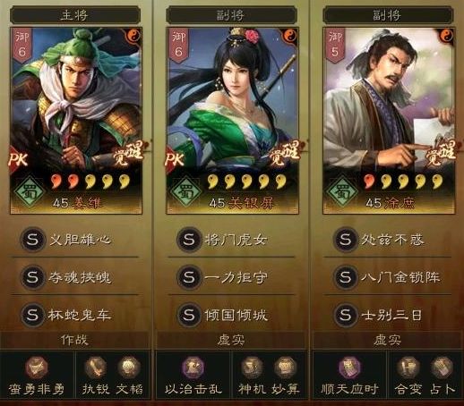4.八门降敌输出,夺魂保姜维,一力保关银屏,士别保徐庶,各有保护不怕速攻。