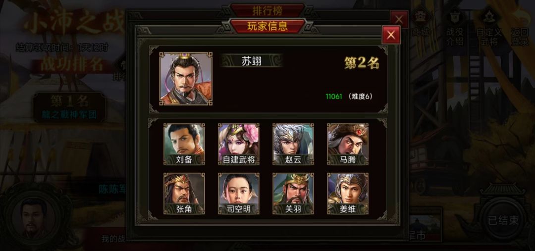 再来看看苏翊军团。苏翊军团武将的配置是:刘备、赵云、马腾、张角、司空明、关羽、姜维+1个自建。