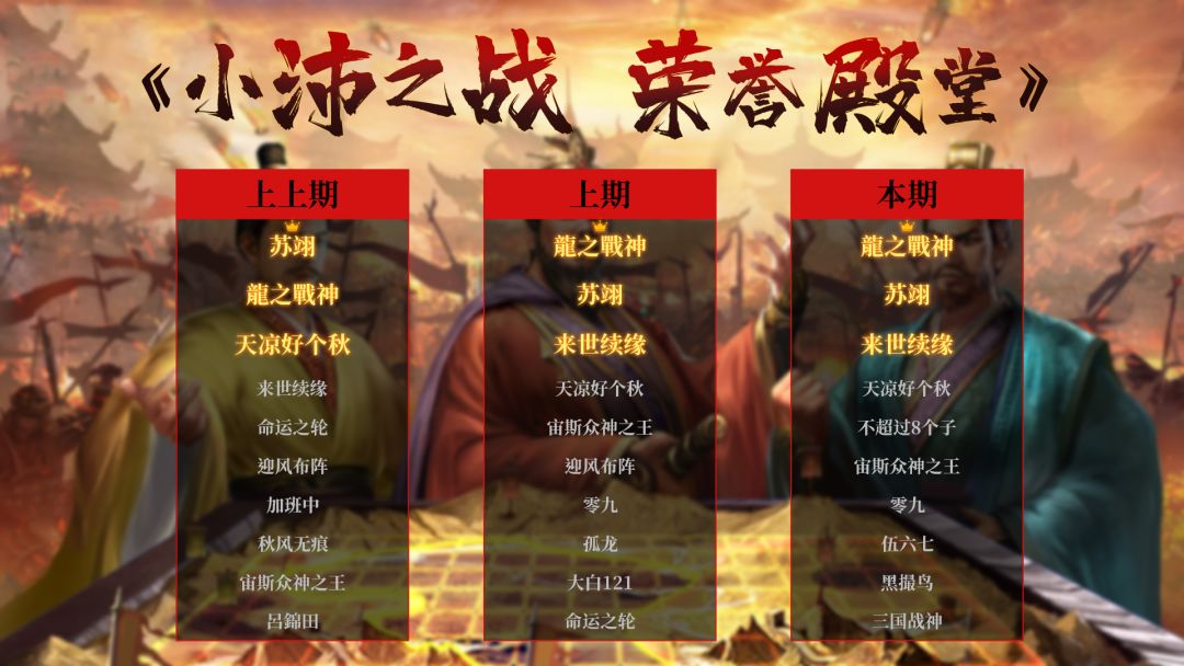 我们的战役周榜栏目升级啦!新的荣誉殿堂正式来袭,以后我们会在每周相关的战役结束后追加最新三期的排行榜名单,每场战役排名前十的主公可以进入我们的荣誉殿堂!