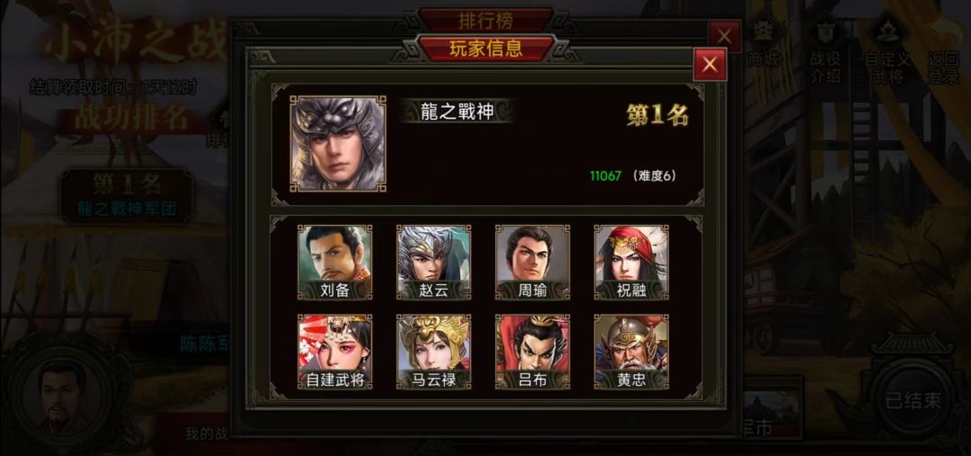 首先是龍之戰神军团。龍之戰神军团的武将配置是:刘备、赵云、周瑜、祝融、马云禄、吕布、黄忠+1个自建。