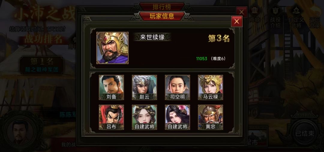 最后是来世续缘军团。来世续缘军团的武将配置是刘备、赵云、司空明、马云禄、吕布、黄忠+2个自建。