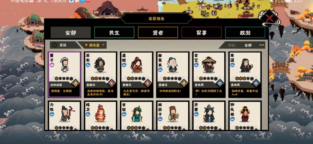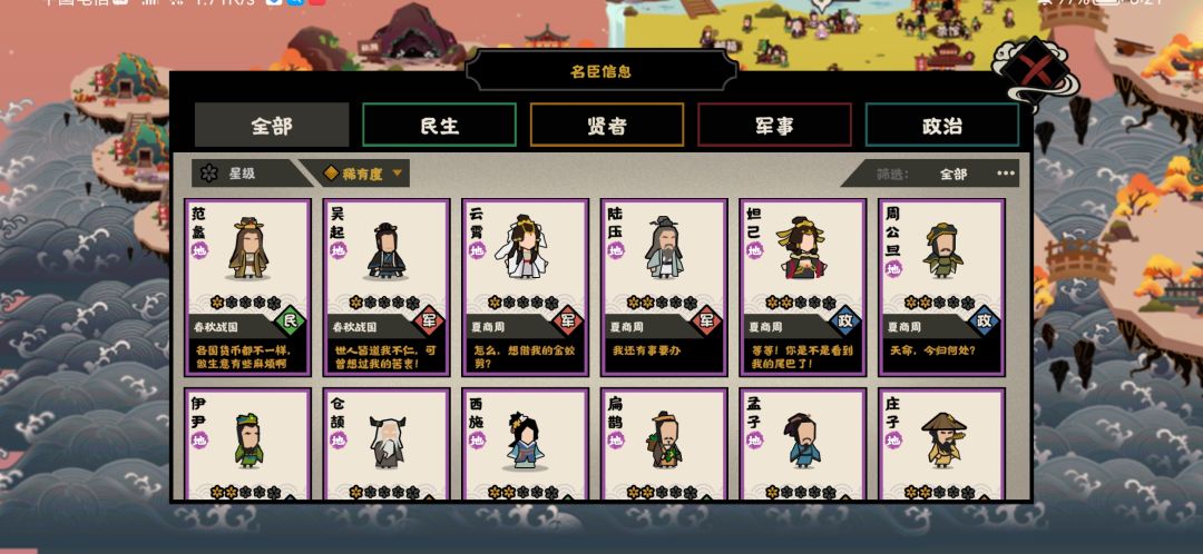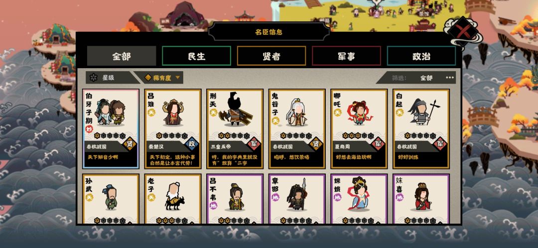 收集难度不大,但是想要升星就需要一定的肝度了,同样,合成需要碎片,升星也需要碎片,名臣二星可以担任太守,三星可以自动寻访,四星守城可以用家仆,五星可以训练家仆当军队。其实后两项没什么太大的作用,只是多少增加一点游戏性,所以也不用太执着五星,推目前的剧本两三星足够了。
