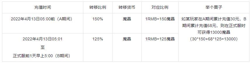 测试服玩家所有充值包含直冲档位、直购礼包等,将会在正式服中按125%-150%比例转移魔晶至正式服,比例根据玩家在测试服期间的充值时间有所不同: