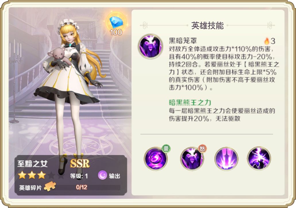 她身上带有暗属性的力量,可以在战斗中发挥强大的力量。她的技能“黑暗笼罩”可以给地人代来强力的伤害,而她随身携带的玩具熊也是有着黑暗力量的“熊王”,在战斗中会配合她发挥出巨大的暗属性力量。