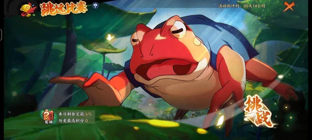 ⭐活动说明:接下来将由自来也老师带学员们来到妙木山的赛场,通过操控青蛙进行跳远,每累计100积分,即可获得一份运动补给宝箱,每天上限5个,快来试试吧!