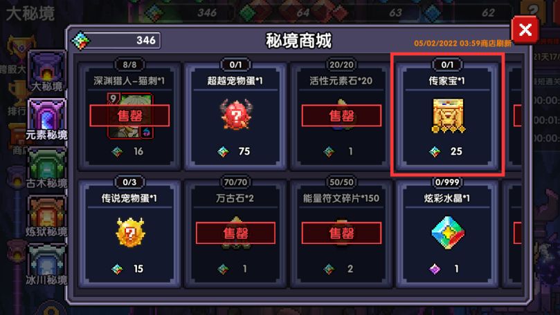 前期可以在解锁大秘境后,可以通过过关来获得传家宝,这个里面有3套25级同色装备(如果此时已有一套可以用的装备,则不需要),有了前期的装备后,就可以通过矿洞、暗金锁定器来获取更高级的装备了