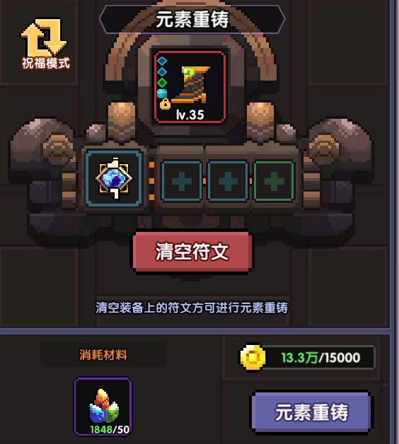 前期先用25级的同色装备,中期直接一口气换成35的装备,30以上的装备消耗元素石特别多(25级装备洗一次5个元素石,35级装备洗一次50个元素石)