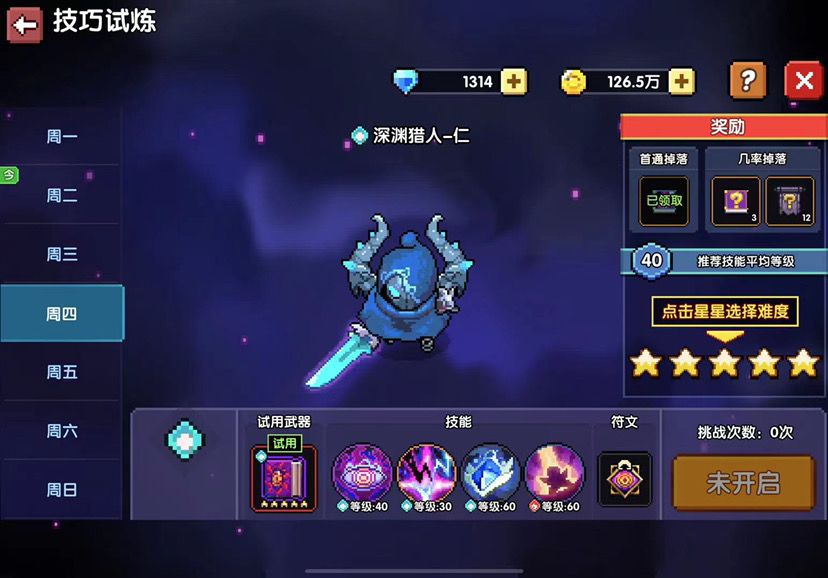 普及一下技巧试炼 (每天一次奖励,再打第二遍没有奖励开不了宝箱。可以累计次数一起打,累计数最多为三次) 好 我们看到周四是我们想要玩的流派 但是今天是周二 哦吼打不了 没事 我们可以赞次数 放在周四打 新手玩家要从一🌟开始打