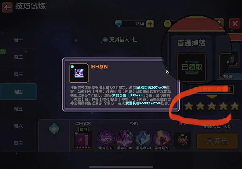 从上图可以看到 五星首通直接给橙色技能 我们要做的就是 例:周四是我想要获取的技能 那么第一周 留三次在周四刷完技巧试炼,解锁三星(可以直接获得紫色技能)然后在第二周留俩次在周四刷完拿到五星首通距离橙色技能 (未通关退出,掉线不会消耗次数,只要没开宝箱可以无限打)缺点是要俩周 时间长了点!装备 宠物什么的就不讲了!不然篇幅过长了!