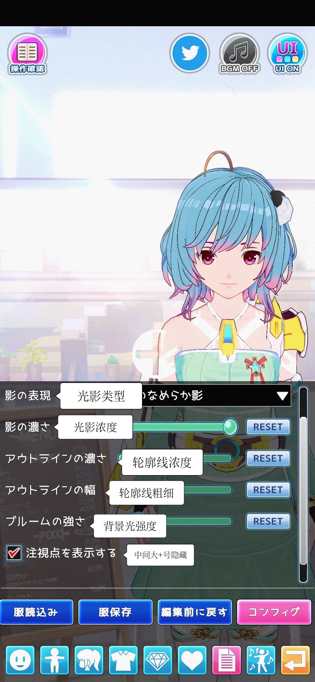 拍摄(截图)时,光照角度、表情、头部朝向可通过左上角“操作確認”点开设置,隐藏菜单选项为右上角“ui on”。该部分仅作为拍照设置,人物卡读取时不读取。