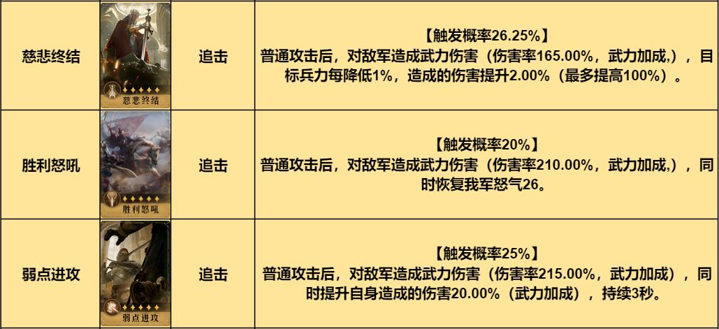 主将技出奇制胜能造成武力和谋略双输出,固有追击技能智勇无双在造成高额武力/谋略伤害的同时,还能降低目标主将属性,与主将技产生联协效果提高自身属性。