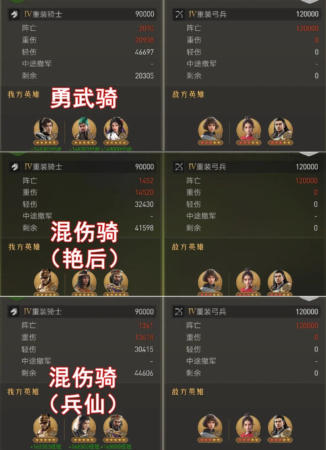 以KD数值(击杀÷阵亡重伤轻伤总和)来直观展现,在同样击杀84000的情况下,勇武骑伤亡4.8w,KD比1.72;艳后混伤骑伤亡3.6w,KD比2.30,明显高于勇武骑;兵仙混伤骑伤亡2.4万,KD比3.44,约为勇武骑的2倍。