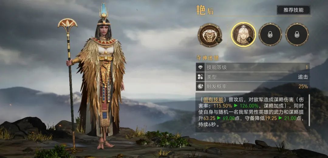 技能可选择几乎量身定制的恩泽庇护,免伤覆盖率极高;另一个技能可选择压迫之袭,它的属性降低效果能与汉尼巴尔的主将技产生配合。