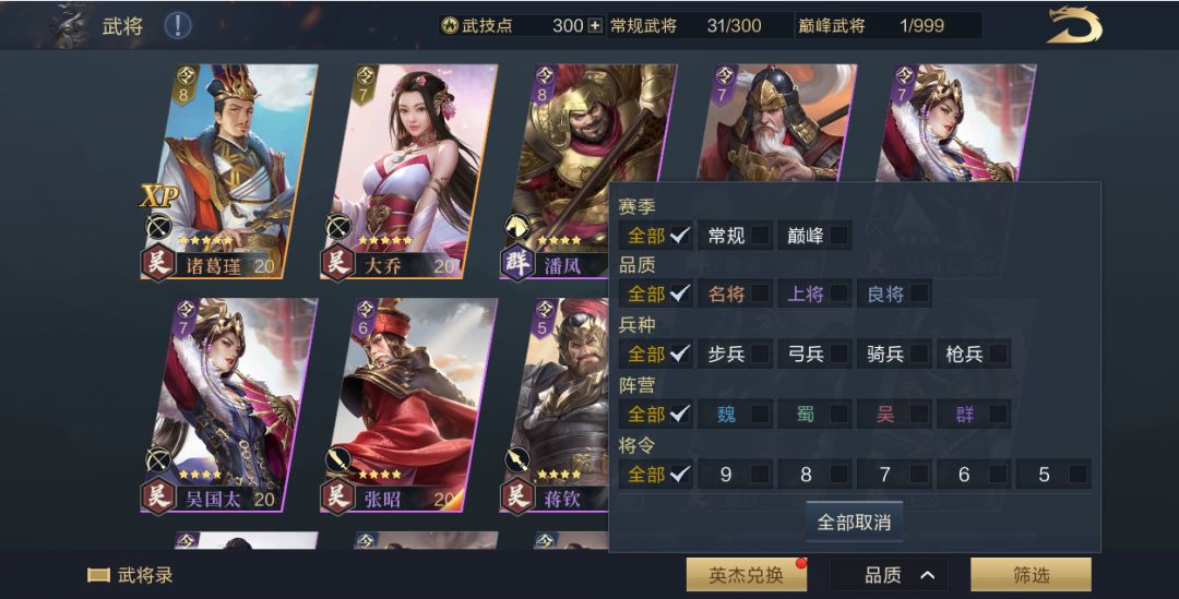 1. 武将背包优化:原武将卡上限更名为常规武将上限,巅峰赛季武将卡将独立计数不再计入常规武将计数中,各赛季原武将卡上限不变。玩家可通过武将卡背包的筛选功能筛选常规/巅峰武将。
