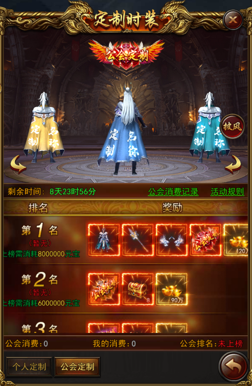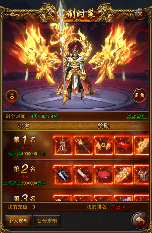 周年庆活动期间,玩家进入“定制时装”主题界面并成功参与相关活动,当达个人消费达到榜单对应要求时即可直接获得包括赤血丹心、勇破三军、气逾霄汉等在内的整套专属定制时装,除此之外还能联系客服进行称号名称、时装披风文字、属性等专属定制;公会定制时装同理。