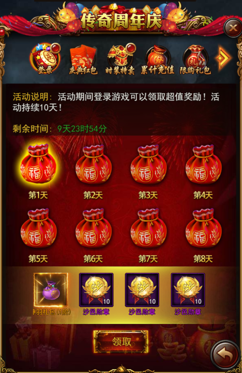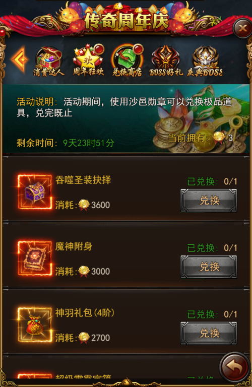 周年庆活动期间,玩家参与游戏内的相关专题活动即可免费领取庆典礼盒、庆典红包、转职卡、圣·开阳、召唤胸甲等海量稀有道具;而使用活动专属道具“沙城勋章”还能免费兑换包括吞噬圣装抉择、魔神附身、神羽礼包(4阶)等在内的海量极品稀有好礼!