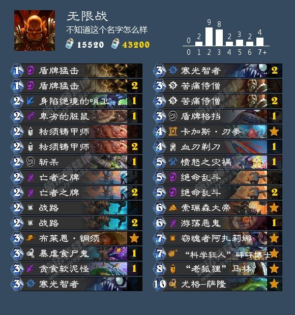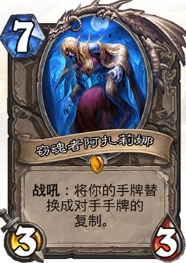 窃魂者(又名733)带上了窃魂者的无限战就不要想着无限了,没什么用,脏就完事了。能用上733的,除了换家德,那就是无限战了,7费基本空过一个回合,再适合不过这种叠甲过手上还没什么资源的卡组了。窃魂者给了玩家一个转守为攻的机会,换完牌之后需要快速转变思路,结合手牌信息,判断下一步的走向。用窃魂者需要你对对方卡组要了如指掌,要知道对方是什么卡组,手上拿的卡大致是什么,这就需要至少是有一定对局经验的(萌新谁会去玩无限战啊?滑稽),用窃魂者一定不要犹豫,甚至要超前判断,不然大多数时候是这样的: