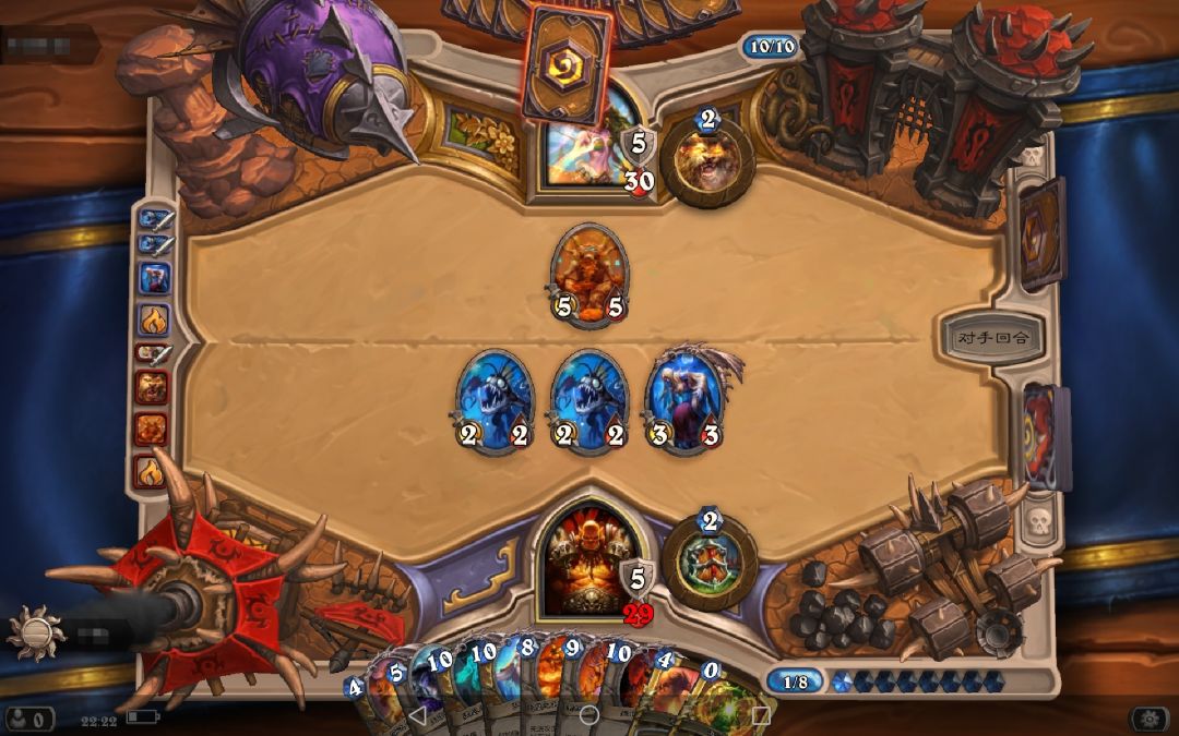 这是一个经典的窃魂者反杀的例子,凭借甲厚的优势,硬抗几个回合不是问题,然后一步一步下恶魔,再变身DK,因为换手牌之前我洗了一波,所以之后我又换了一次手牌,这样我的资源就相对更多了,优势逐渐扳回我这边。(要不是手上有个鲁莽风暴,不知道还以为术士内战。)