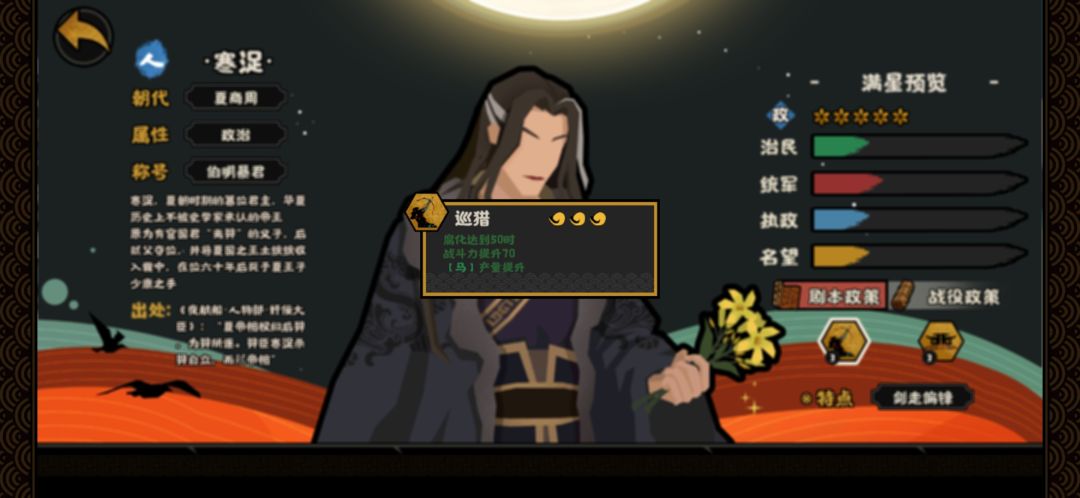 玩法是这样的,开局随便升一下城市,小挂会机,等资源够了,开玉盘快速启动角色政策,达成战力差,然后就是砍砍砍。结束后可以保持高军心和民心