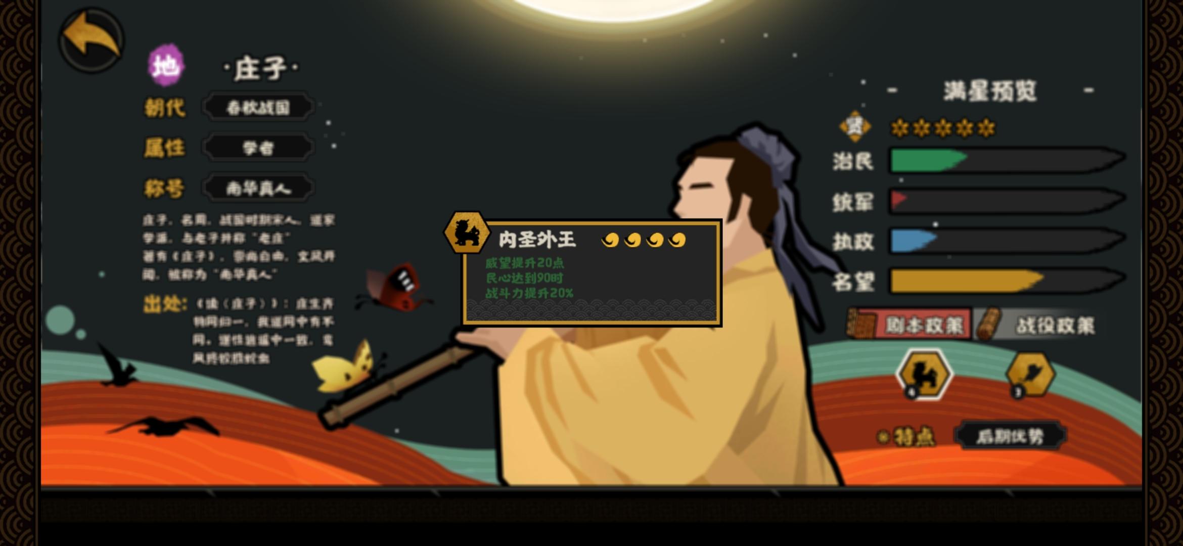 庄子:提供20%的百分比战力加成,和无上限战力提升,同时保持高民心。超模的玩意,20%战力加成加无上限战力提升简直了!