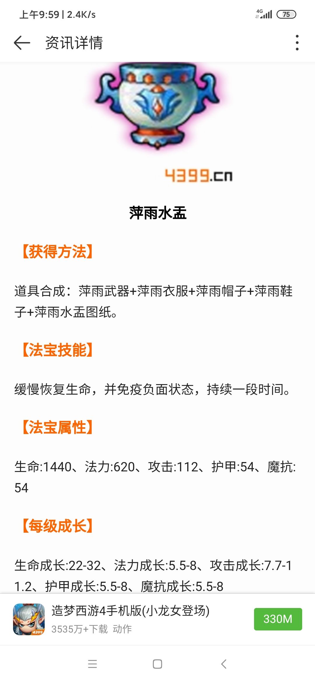 萍雨水盂:主线法宝,合成获取,高额回血、免疫控制,实用性★★★★★,美中不足就是那紫色品质,如果平民不想氪法宝的话还是非常推荐盆子的