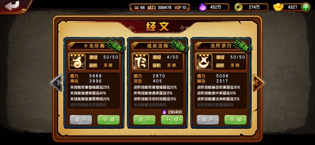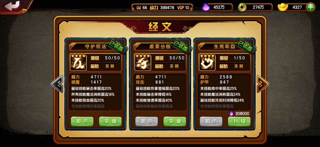 前期千万不要乱合成经文(合成之后再次抽到这个经文只有百分之七十的经文碎片,而且经文一般破紫之后才有用,所以先攒攒经文吧)