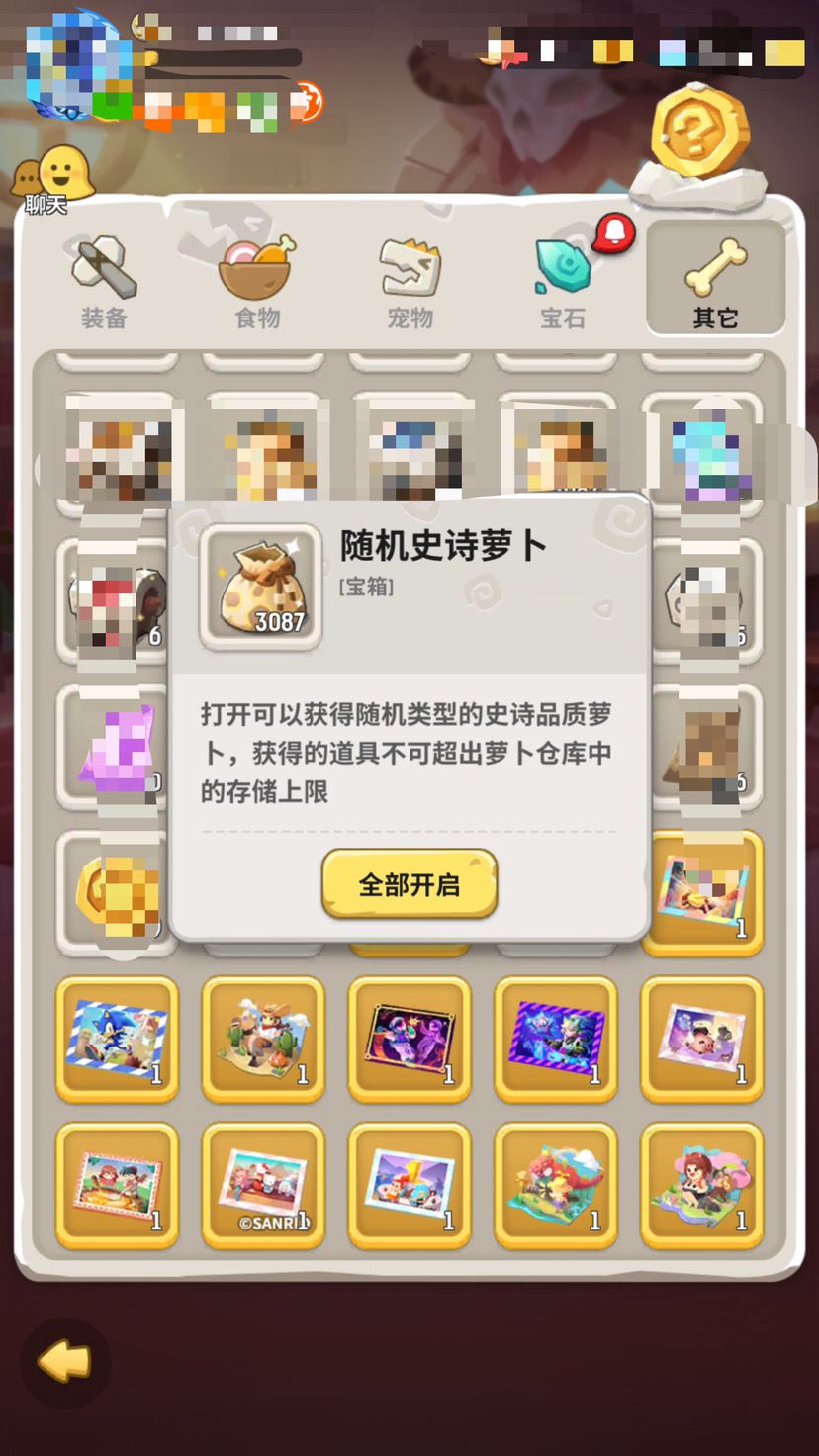 每种萝卜上限500,建议官方修改下设定,可以选择数量开启包裹