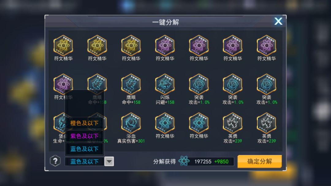 其次和大家介绍一下符文的分解和升级,当我们符文塔挑战的层数随着游戏深入慢慢增加的时候,我们将会拥有更多种类和不同属性的符文,这些远远超出了符文孔的数量。我们将会挑选出精英符文,选择镶嵌,其他的符文可以进行分解,获得的符文精华是符文升级的重要材料。