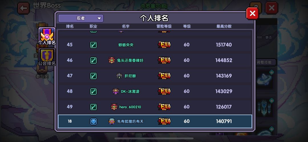 另外为什么不推荐新人玩忍者呢,看下图我的战士可以世界打18名,同样的分数在忍者都快掉出50名了。(还有类似巅峰竞技场,按照职业分排名的活动)