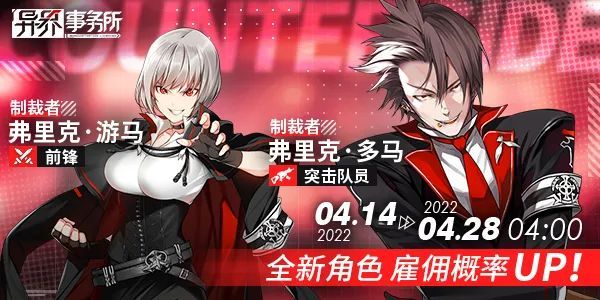 来自“堕落之鹰”的SSR突击队员弗里克·多马,以及SR前锋弗里克·游马将在本周四更新维护后实装,两位角色的雇佣概率UP卡池同步开启。弗里克·多马是能封锁敌人的战斗能力,使敌人慢性死亡的远攻射手;弗里克·游马是一名扰乱敌人阵型的冲锋战士。