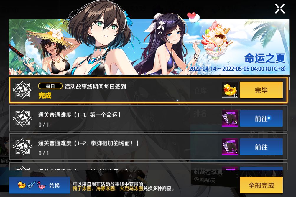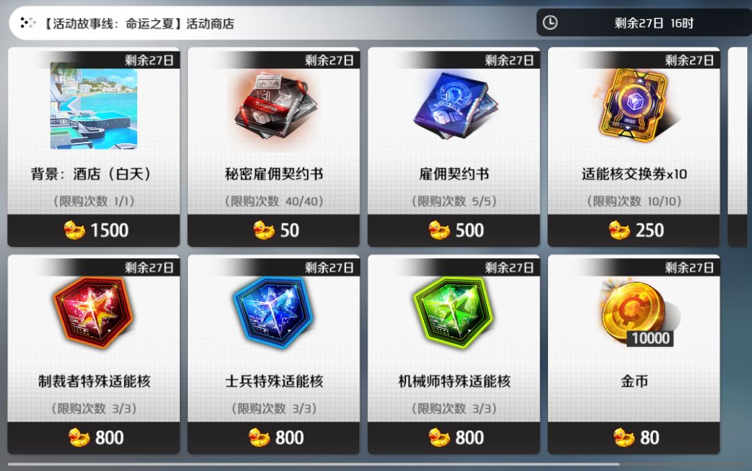 限时剧情“度假·命运之夏”将于本周四更新维护后陆续开放(本周开放ACT.1部分),限定任务以及限定商店将同步开放。完成ACT.1剧情将得到活动道具“鸭子游泳圈”,使用该道具将可在限定商店内兑换到“背景:酒店(白天)”,秘密雇佣契约书,雇佣契约书,各种特殊适能核等作战道具。