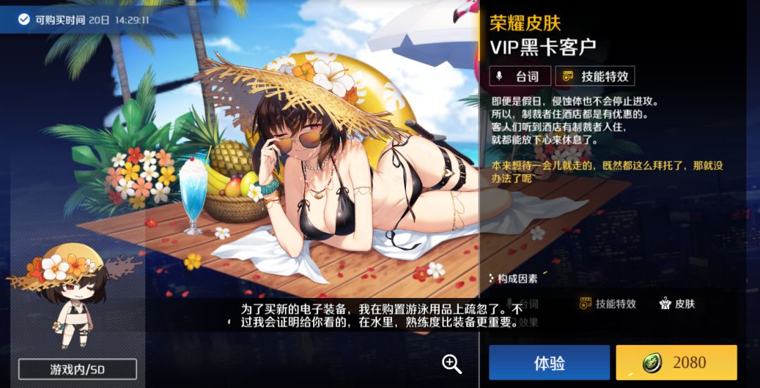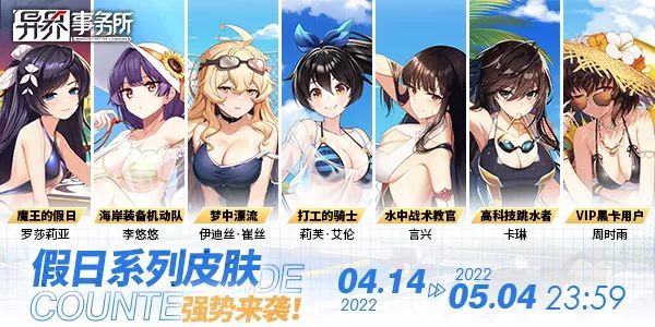 催促热夏的到访,叫醒沉寂过一个冬季的海滩。假日主题系列皮肤将陆续登陆皮肤商店,限时售卖!首批假日皮肤【言兴-水中战术教官】、【卡琳-高科技跳水者】、【周时雨-VIP黑卡客户】、【伊迪丝·崔丝-梦中漂流】、【罗莎莉亚-魔王的假日】、【李悠悠-海岸警备机动队】、【莉芙·艾伦-打工的骑士】等,将在本周四更新维护后上架皮肤商店,老板可为中意的员工们使用绿币或钻石获取。