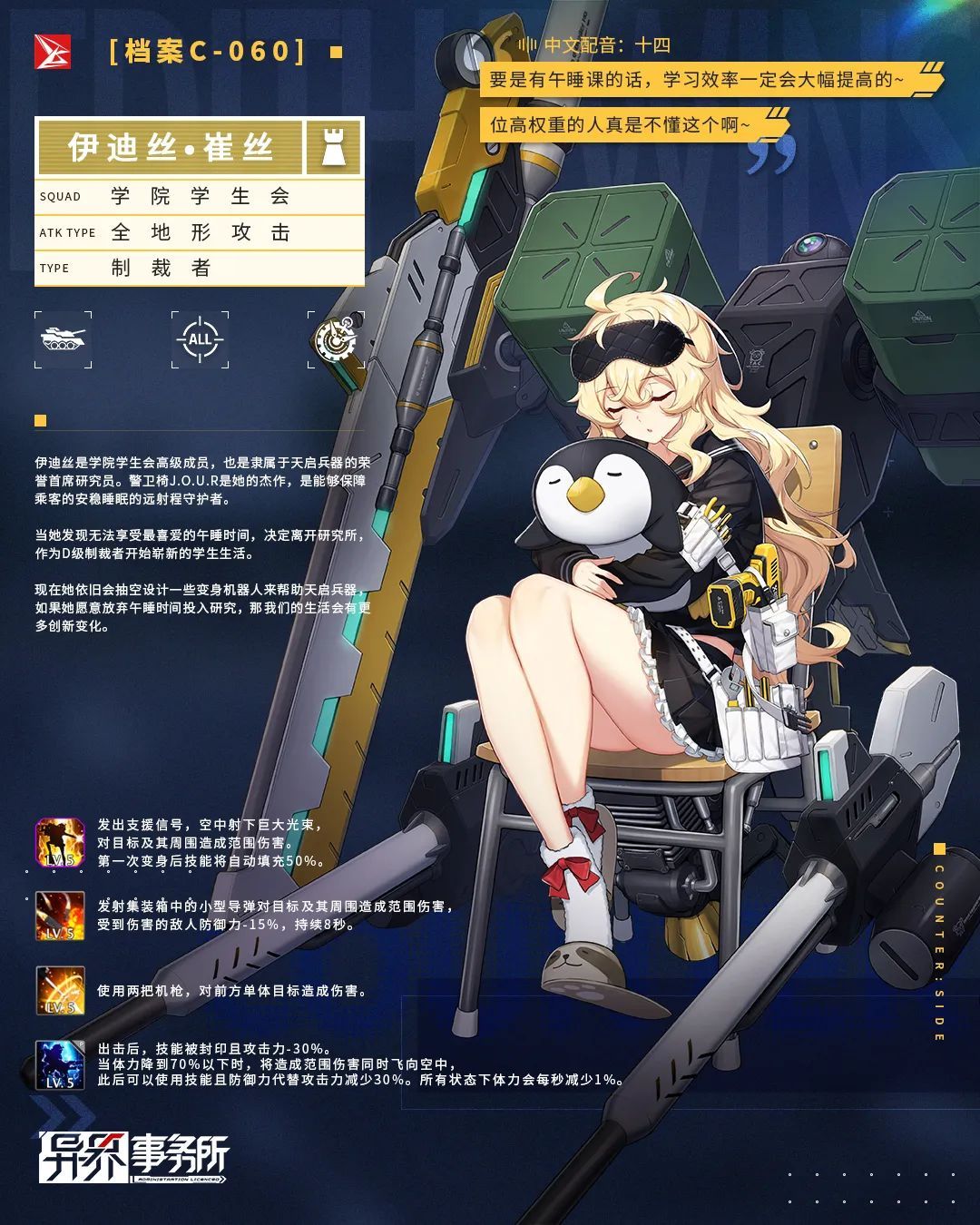 来自学院学生会的新SSR制裁者“伊迪丝·崔丝”将于本周四更新维护后实装,角色专属的雇佣概率UP卡池同步开放。伊迪丝·崔丝是可提供远射程伤害的塔单位,当其受到一定伤害并苏醒时,将造成巨大的范围伤害。