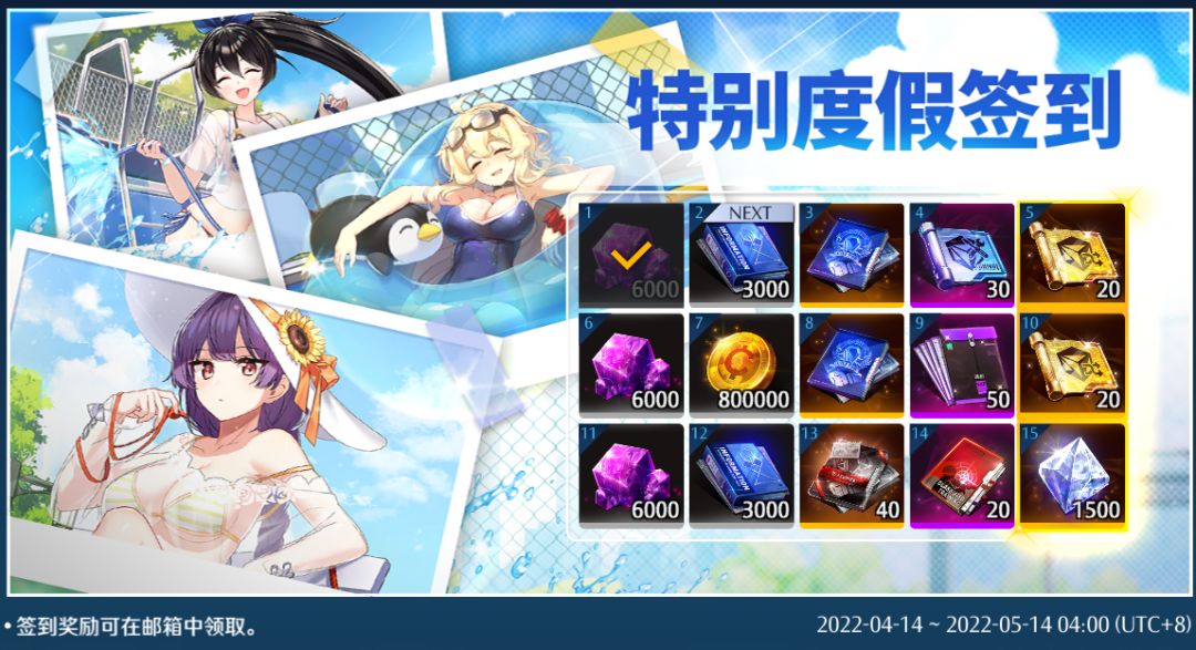 海浪不仅会捧着灼热的邀请来挽老板的手,还会将命运之夏的礼物送至老板们面前。在签到活动期间内,完成签到将得到秘密雇佣契约书、雇佣契约书、套装二进制、二进制系统、特别能力鉴定书,以及大量的信息、能晶、金币等在内的资源。签到活动期间,老板每日首次登录游戏时将自动为您签到,您可至邮箱内收取您当日的签到礼品。