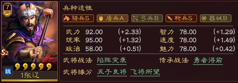张辽止啼,大家都不陌生,爆头骑的开山老祖。属性、战法方面都非常优秀。美中不足的是,没有连击(太贪了吧,张辽还想要连击?),同时爆头玩法,在战功、战损上有一定的局限。张辽更推荐的玩法是奸雄骑,以及不要奸雄的奸雄骑。