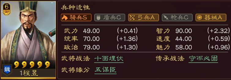 三战中顶级C位之一,自带战法可与陆逊比肩,美中不足的是属性比陆逊差不少。陆逊是,大量爆发+灼烧+震慑;而程昱是,大量爆发+破防+禁疗,各擅专场、各有优劣。