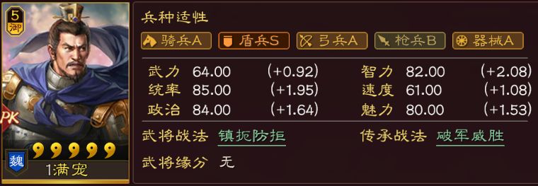 太尉盾的威名早就传扬四海了,满宠+曹操的搭配,非常契合,同时还有机会废掉部分对手的指挥效果。但是弊端也很明显,就是仍然干不过当锋摧决,甚至更怕当锋摧决,当锋一下打曹操,直接曹操战法就伪报了。