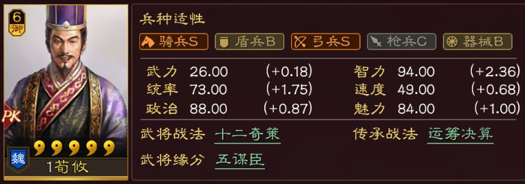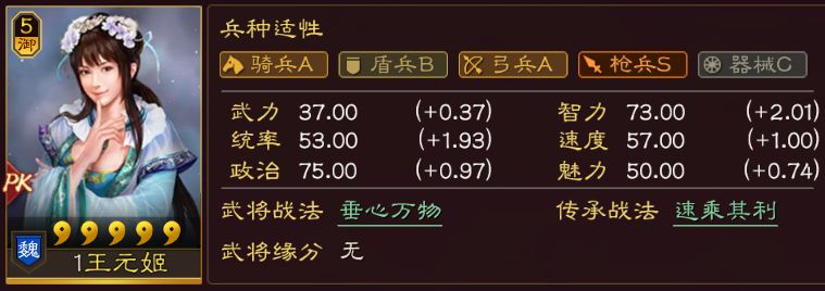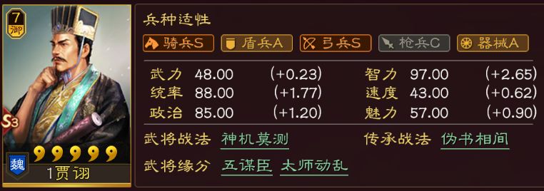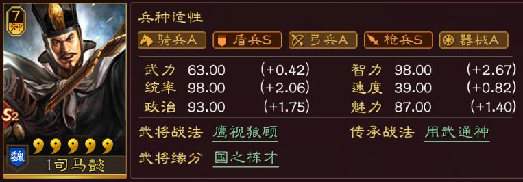 直接看面板,超高统率的同时,拥有二线的智力、速度,同时武力也不低,虽然用处不大,但对于一个辅助来说,这个属性,着实超模。