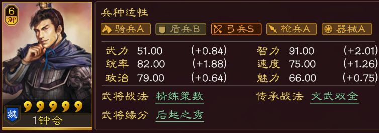 盛气凌敌的主动武将版,因为弓兵适性S,并且战法需要准备,所以不是很能融合到魏国的体系中去。但是缴械这个效果,下限是比较高的,至少可以减少对方几轮平A。并且在战斗后5回合,想去阻止对手平A是比较困难的,只能靠震慑、混乱,钟会的缴械在这里就是另外一个选择。