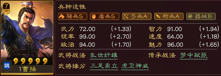 关键是战法,曹操战法能给2个队友提供大约25-30%的增伤,自己还有约30%的减伤。这个效果,非常强力。强在哪里?等于带上曹操,我就直接拥有了另外两个队友各30%输出=单个武将60%的输出,同时曹操一般是辅助定位,是啥概念? 直接决定了有曹操的队伍,必然能打又抗揍。